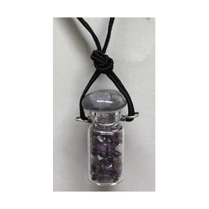 1 1/2" glass vial filled with varied gemstones, on a 30" black satin cord. This vial cannot be opened.